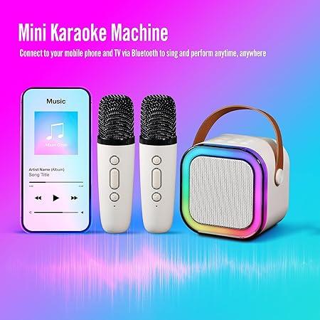 Mini Karaoke Machine for Kids and Adults, with 2 Wireless Microphones and Lights, Compatible with All Smartphones, Party Essential Toy (Beige)
