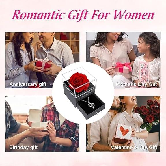 About This ItemPackage Contains: 1 Preserved Rose with Heart Shape Necklace "I Love You" in 100 Languages Gift Box.Romantic Gift for Her: Love Necklace with nano-micro engraving technology showing “I Love You” in 100 languages — a symbol of eternal love and happiness. Ideal for mothers, wives, and girlfriends.Versatile Decoration: Eternal Rose adds beauty and romance to any room with premium packaging — perfect for gifting directly.Perfect Gift: Suitable for Valentine’s Day, Anniversary, Birthday, or Wedding. A thoughtful gift for girlfriend, boyfriend, husband, wife, or family.Gift Suggestions: Ideal for Mother’s Day, Women’s Day, Anniversary, or Birthday gifts for Mom, Wife, or Grandmother.